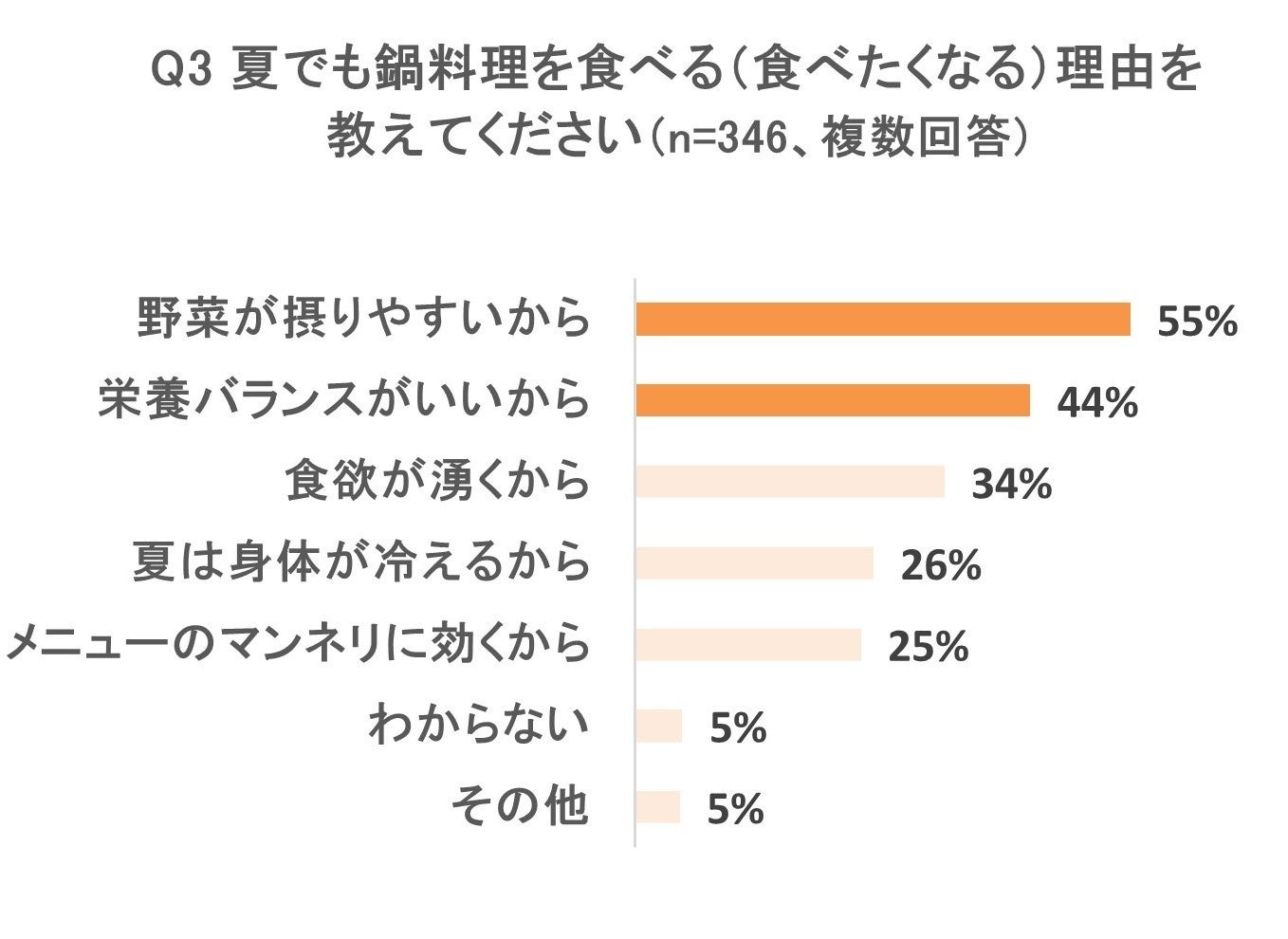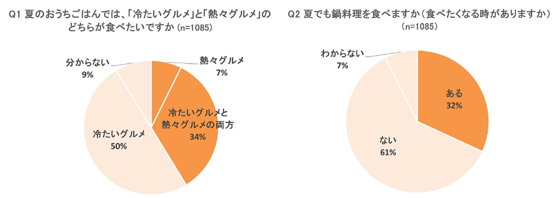 記録的猛暑が続く今夏、全国の30~60代の男女1085名に「猛暑の夏の鍋事情」について調査を実施したところ、意外にも41%がおうちごはんで食べたいグルメで「熱々グルメ」を選択しました(Q1)。そして32%が「夏でも鍋料理を食べる(食べたくなることがある)」と回答(Q2)。その理由として半数前後が「野菜が摂りやすいから」「栄養バランスがいいから」と回答するなど(Q3)、まだ暑い時期でも鍋を食べたいニーズがあることが明らかになりました。