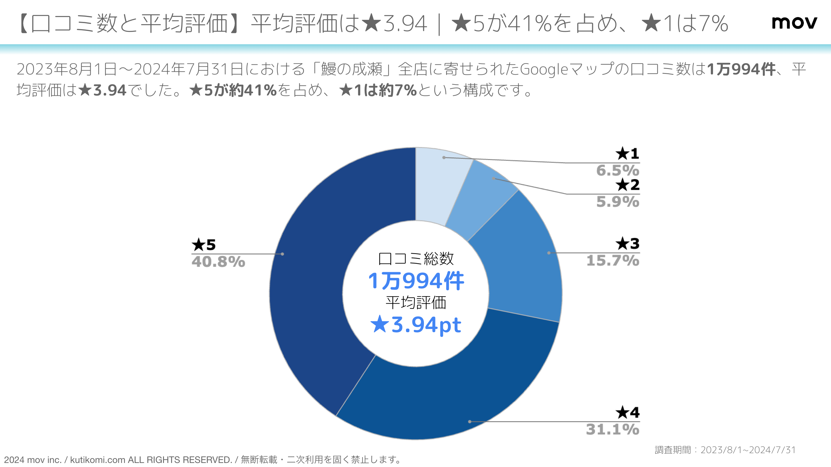 2023年8月1日〜2024年7月31日における「鰻の成瀬」全店に寄せられたGoogleマップの口コミ数は1万994件、平均評価は★3.94でした。★5が約41%を占め、★1は約7%という構成です。