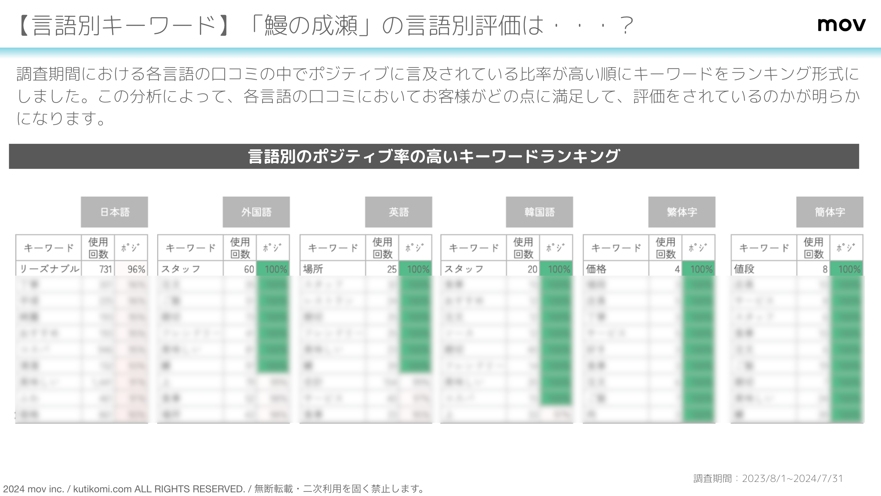 調査期間における各言語の口コミの中でポジティブに言及されている比率が高い順にキーワードをランキング形式にしました。この分析によって、各言語の口コミにおいてお客様がどの点に満足して、評価をされているのかが明らかになります。