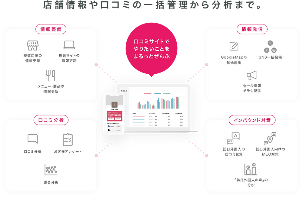 口コミコムは、国内外の口コミサイトを”もっと”売上に変える「口コミサイトの一括管理ツール」です。口コミの情報を活かした店舗改善やGoogleマップ・口コミサイトからの集客数増加を支援します。