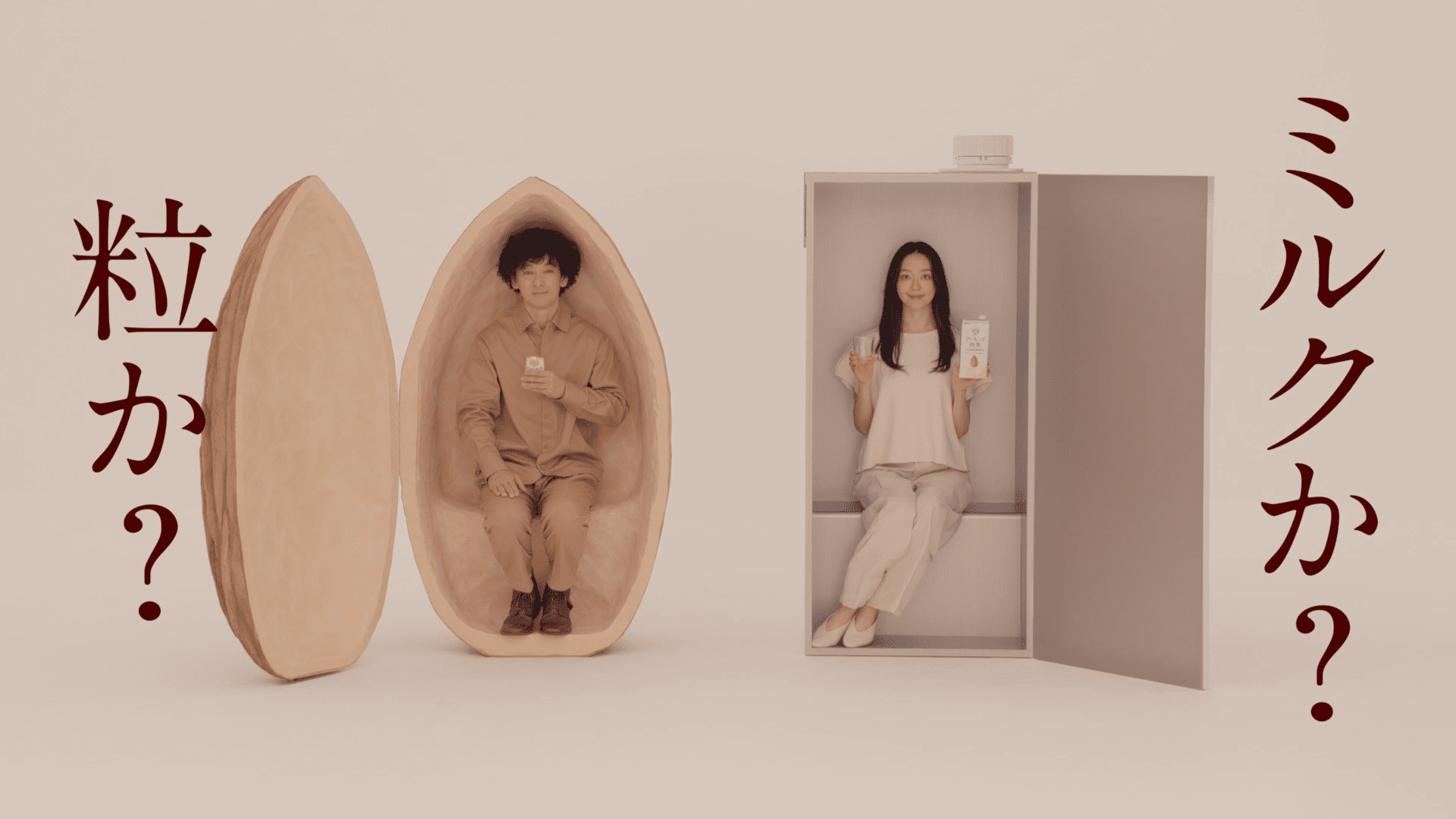 CMの舞台は、巨大な「アーモンドの粒」と「アーモンド効果」のパッケージが並んでいる不思議な空間。アーモンドの粒が2つに割れると、内側に座っているのは滝藤さんでした。同時に「アーモンド効果」のパッケージ前面が扉のように開き、中から松島さんが登場します。