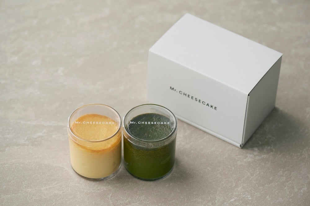 手土産にもおすすめなカップタイプのMr. CHEESECAKE。シグネチャーフレーバー「Mr. CHEESECAKE Petit Classic」と「Mr. CHEESECAKE Petit Green tea」をセットでご用意しました。ケーキの上はベイクド、下はレアのような1つで2つの食感をお楽しみいただけます。