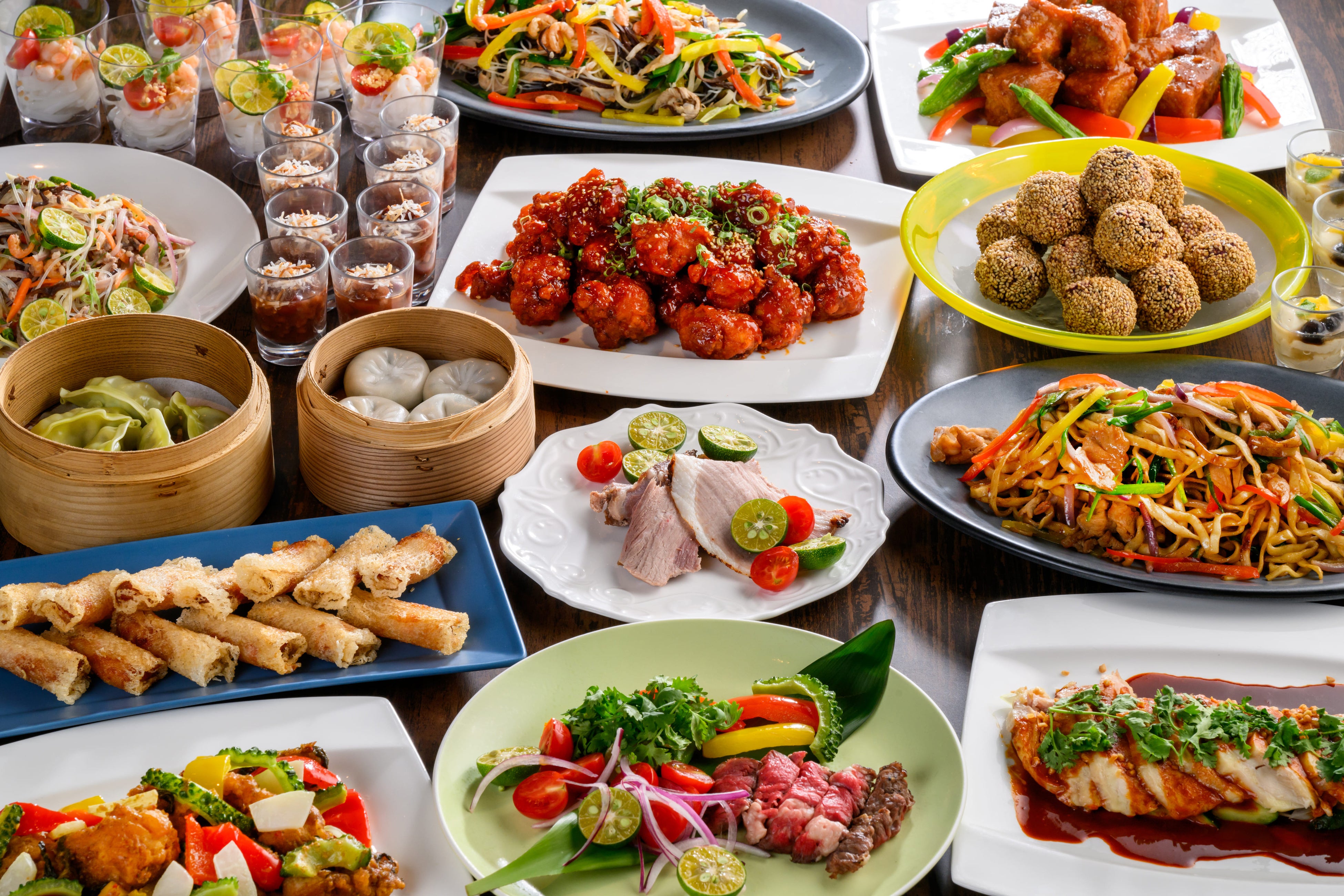 沖縄ステーキ 3種のアジアンソース、沖縄県産アグー豚のシュラスコロースト 2種のアジアンソース、冷製ココナッツトムヤムクンのフォー、シークヮーサーヤムウンセン、コーレーグースのよだれ鶏、海鮮網春巻、ゴーヤーの蒸し餃子、ニラ饅頭、若鶏と島野菜 バジル風味のチャンプルー、沖縄味噌のヤンニョムチキン、青パパイヤともずくのビーフン、プルコギ風ラフテー、沖縄そばでつくるシンガポール焼きそば、沖縄そば、五目餡かけ出汁
