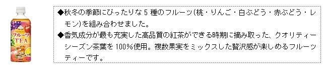 この度、新発売する「贅沢香茶 フルーツティー ホット&コールド」は、秋冬の季節にぴったりな5種の果実(桃・りんご・白ぶどう・赤ぶどう・レモン)を組み合わせ、香気成分が最も充実した高品質の紅茶ができる時期に摘み取った、クオリティーシーズン茶葉を100%使用。こだわり抜いた複数果実をミックスし、贅沢感と華やかな香りが楽しめるフルーツティーです。