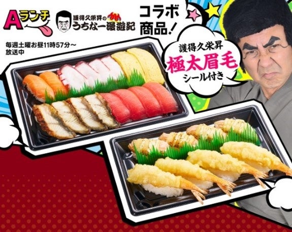 この度、沖縄県の皆さまに喜んでいただきたいという想いから、琉球放送「Aランチ」内のコーナー“護得久栄昇のうちなー漫遊紀”とスシローが初コラボし、沖縄県で絶大な人気を誇る護得久栄昇さんに考案いただいた、護得久栄昇極太眉毛シール付きの特別なお持ち帰りセットを沖縄県内のスシローで販売いたします。