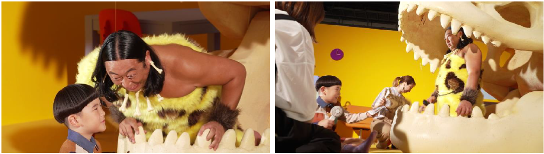 桜太郎くんが、やっぱりビクっとなっちゃうんですよね。だって、恐竜の化石の口から出てくるんですもんね。「ここから出てくるからな? 俺な?」って何回言っても、びっくりしていましたね。「絶対、この後出るからびっくりすんなよ?」って言っていてもビクってなって。やっぱり無理なんですよね、子どもはね。
