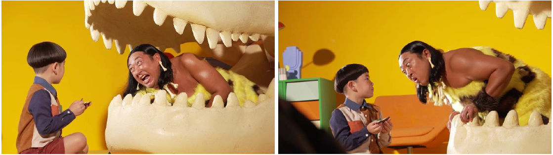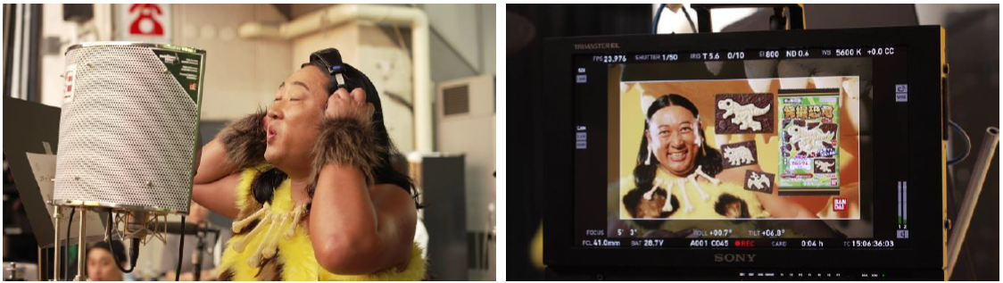 今回のCMの目玉となるのは、ティラノサウルスの巨大な頭の化石のセット。体重100kgもあるという体の大きな秋山さんがすっぽりと中に収まるほどの巨大さです。男の子がキャラパキを割る音を聞いた途端、パカっと化石の口が開き、骨の中に閉じ込められていた秋山さんが勢いよく登場します。子役の桜太郎さんは、その様子を見ても動じず、キャラパキを割り続ける…シーンのはずなのですが、秋山さんの大迫力に驚き、ビクっと反応してしまい何度かNGに。その様子に「びっくりした?」「そりゃびっくりするよな~」とすかさずフォローする秋山さん。現場にいるスタッフみなが思わず微笑んでしまう、微笑ましいNG でした。
