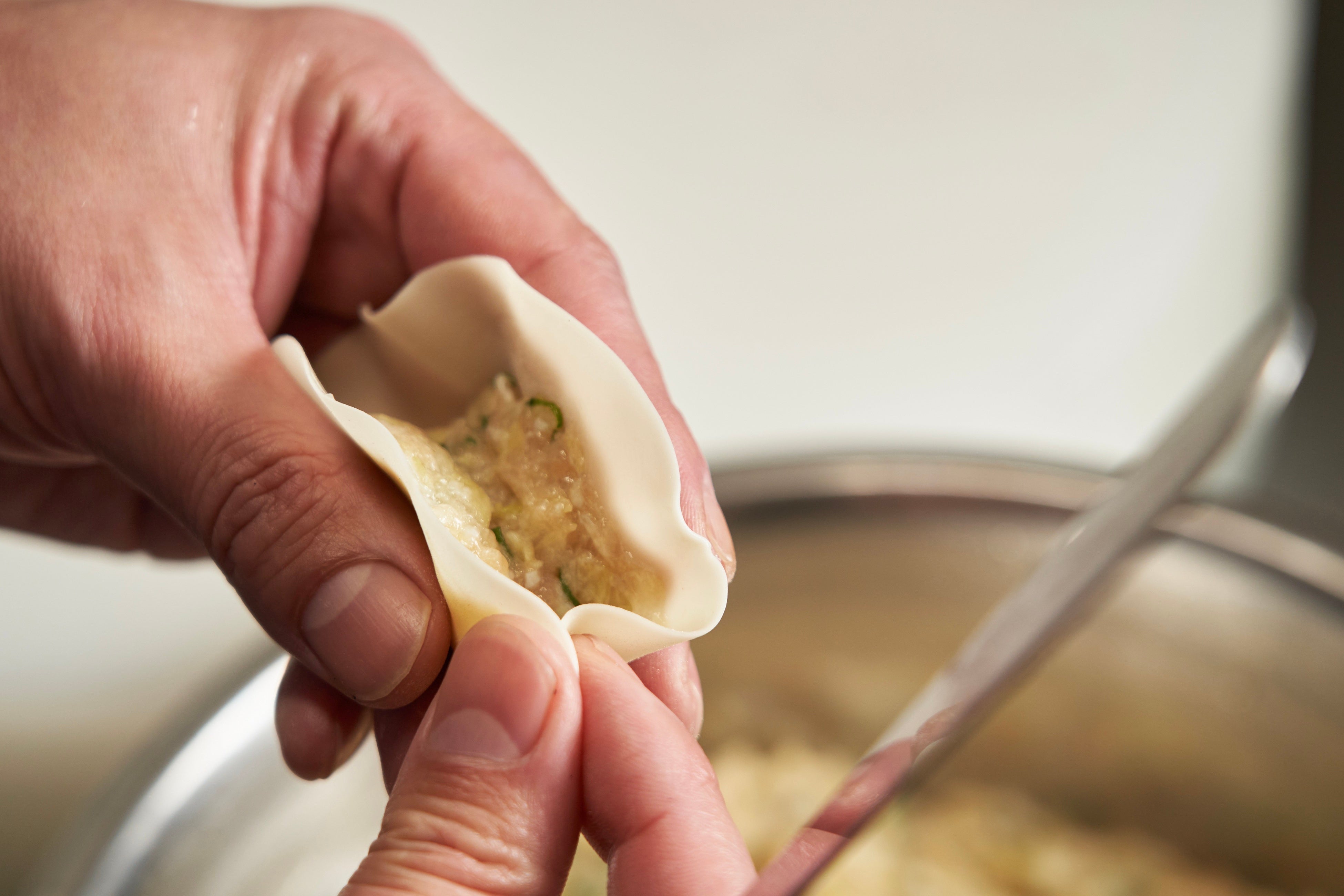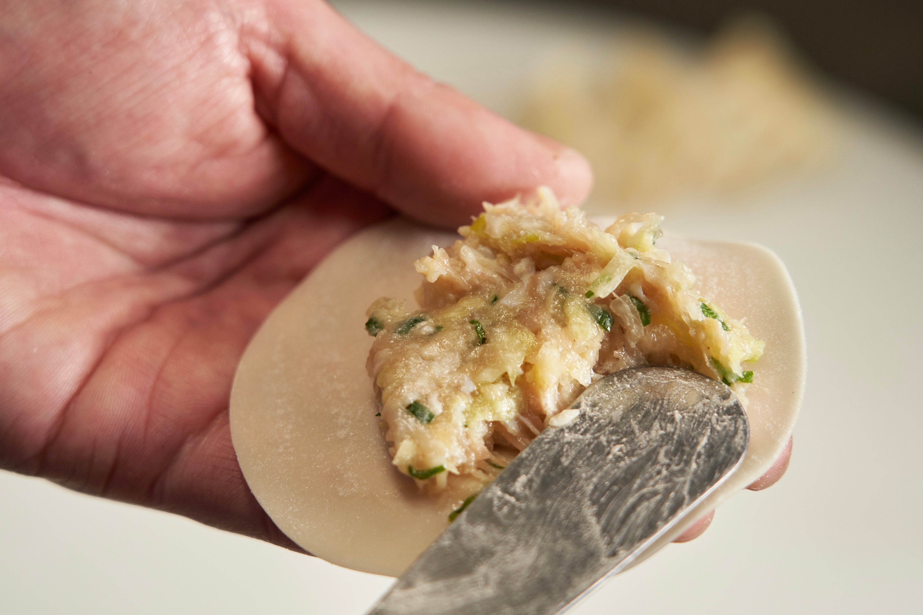 餡には、臭みの少ない鶏肉を使用。鶏白湯の旨みを生かすため、にんにくやショウガは練りこまず鶏白湯にのみ使用。スタンダードな「鶏白湯餃子」のほか、鶏白湯餃子にしそを加えてさっぱりと食べられる「しそ餃子」、鶏肉をワンランク上の銘柄鶏にした「銘柄鶏餃子」(鶏の種類は時期ごとに変更)の3種類をご用意しています。