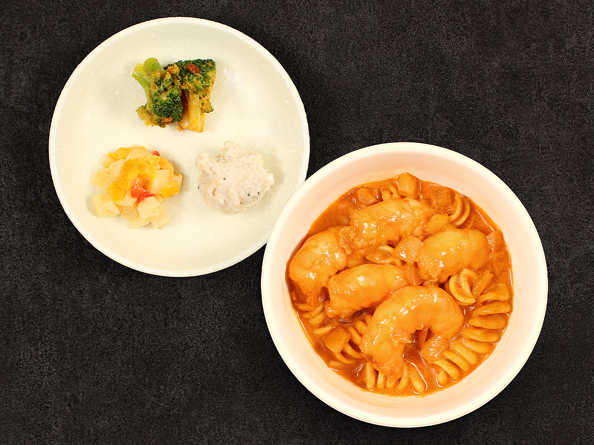 ぷりっとした大きな海老とトマトの旨みをギュッと閉じ込めた、贅沢な味わいのスープパスタが登場!特製のスープは生クリームでクリーミーに仕上げています。ゴロっとした海老やショートパスタとスープを、大きめのスプーンで頬張っていただきたい!一滴残らずスープを味わっていただきたい!頑張った自分へのご褒美に是非食べていただきたい!そんな思いを込めて開発しました。