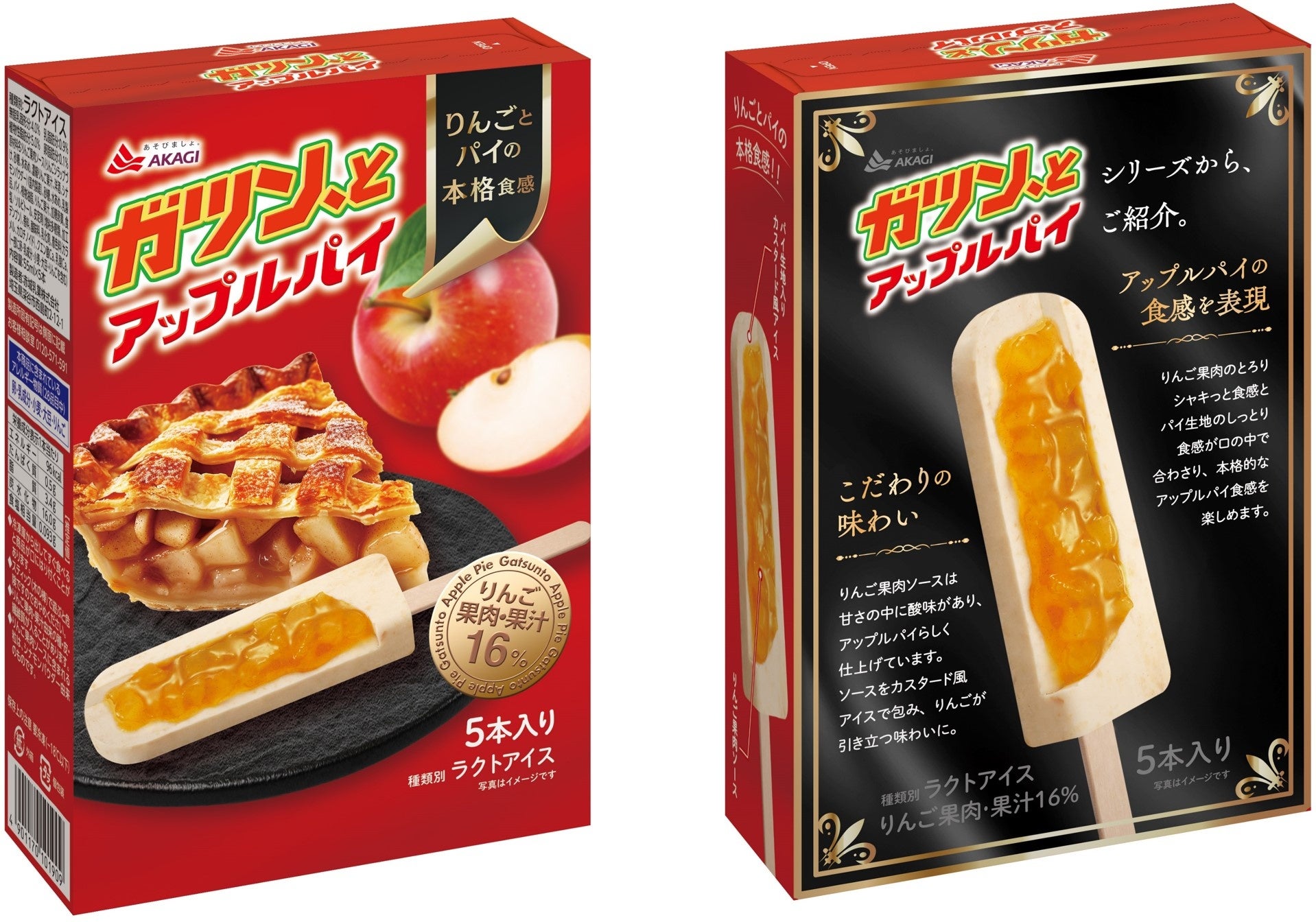 「ガツン、とアップルパイ」は、カスタード風クリームアイスにりんご果肉ソースをガツン、と入れ、ガツン、とブランドらしい果肉感を表現しました。また、アイス部分にはアップルパイらしさを表現するために、パイクランチを入れて、スイーツ感のある仕立てのアイスにしています。今回、「ガツン、とアップルパイ」の美味しさをもっと伝えたく、片面に商品の特徴とこだわりを説明した新パッケージで発売します。ぜひ一度ご賞味ください。