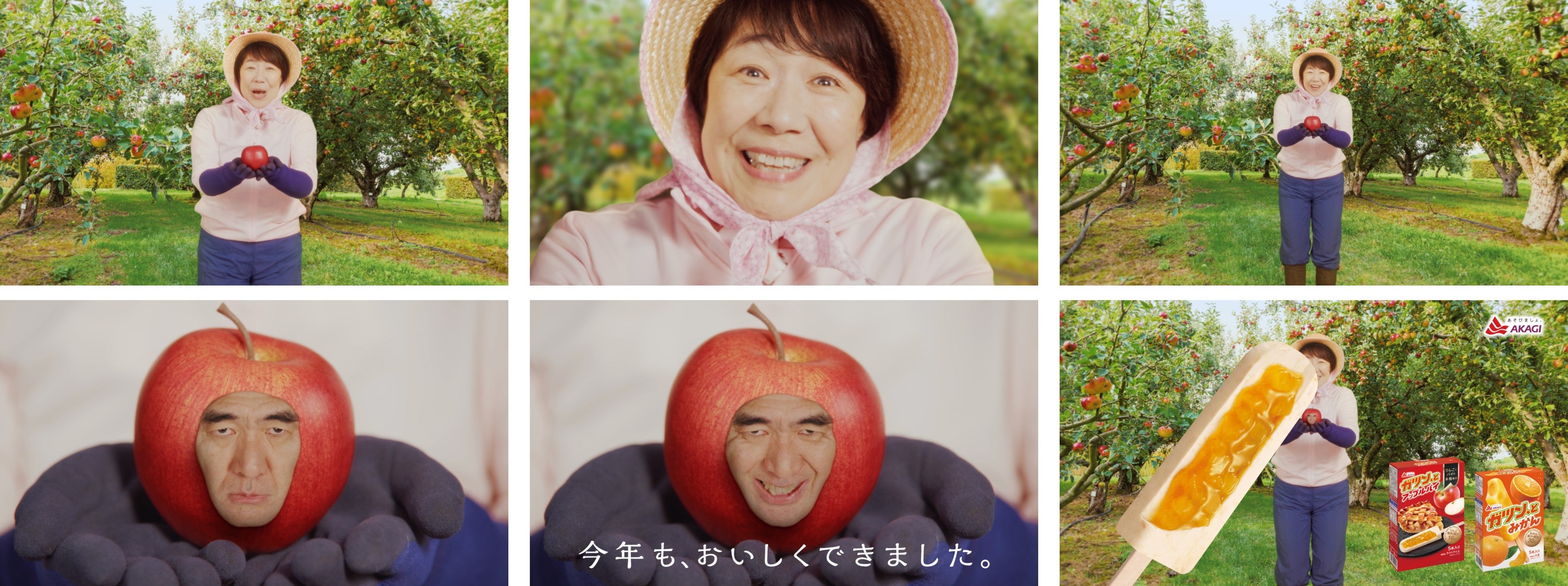 真心こめて作った商品であることをりんごを大切そうに差し出す農家さんと「今年も、おいしくできました。」 と呼びかけるりんご江頭さんで表現しました。