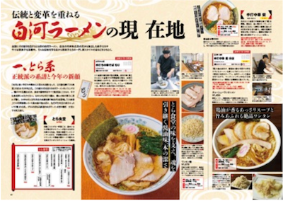 全国にその旨さを広げる、「とら食堂」をはじめとする白河ラーメン。「とら食堂」店主・竹井和之氏の元から独立した弟子たちはもとより、今では孫弟子も活躍しています。そんな伝統を受け継ぐ店から、孫弟子たちの一門である「手打中華 やたべ」や「中華そば屋 佐藤」、今までとは違う新スタイルを打ち出す「白河中華そば えん」などを取材。系図とともにおいしさの秘密や受け継がれる理由をひもときます。