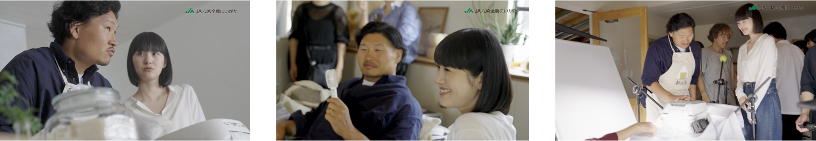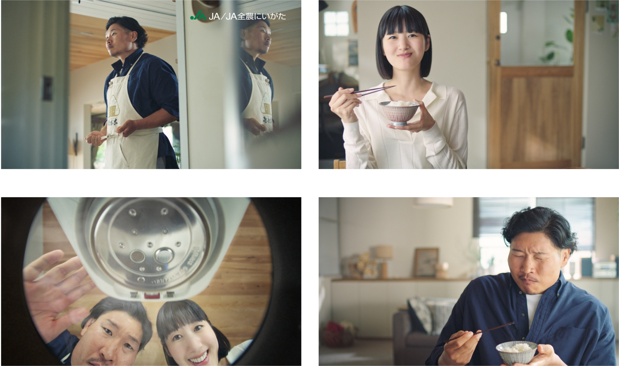 ご夫婦で初のTVCM共演となるお二人。撮影現場は終始笑顔が絶えず、カメラの前のお二人は、幸せな家庭そのものを映し出されているかのようで、あたたかい雰囲気を表現してくれました。稲垣啓太さんは、稲垣貴子さんと一緒にいると「笑わない男」として知られるイメージから一変し、柔らかい笑顔を何度も見せてくれました。撮影スタッフ一同も自然と笑みが溢れ出し、現場全体が穏やかな空気に包まれました。新潟米の食事シーンでは、頬張った瞬間思わず「おいしい!」と声に出し、幸せそうな笑顔を見せてくれました。