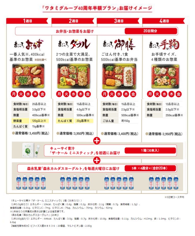 2024年は、5月16日よりワタミグループ40周年を記念して「40周年半額プラン」の販売をしており、多くのお客さまにご注文をいただいております。プランの内容は、お弁当・お惣菜20日分にキューサイの青汁「ザ・ケールミニスティック」1箱(30本入り)と森永乳業の「森永カルダスヨーグルト」20本をお付けして通常価格20,650円(税込)を半額以下の9,900円(税込)でご自宅までお届けいたします。