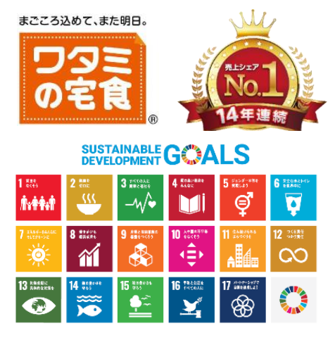 「ワタミの宅食」は、日替わりのお食事と“まごころ”をお届けすることで“社会を支えるインフラ”となることを目指し、事業を展開しています。お弁当・お惣菜は、お客さまと同じ地域に住む“まごころスタッフ”がお届けしています。毎日約23万食のお弁当・お惣菜をお届けしており、病者・高齢者食宅配市場「売上シェア14年連続 No.1」※(2010年~2023年)を達成しています。2020年3月には、業界として初めて、自社弁当容器を回収し、新たな容器としてリサイクルする取り組みを全国に展開するなど、SDGsの目標達成にも貢献しています。