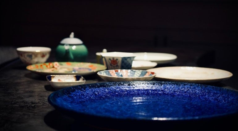 料理にとっての衣装である器。厳選された漆器、磁器には、日本らしさを感じる四季折々の自然や花鳥風月が美しく表現されています。輪島塗漆器、伊万里焼、信楽焼、そしてアンティークの貴重なグラス等、お料理とともにお楽しみください。