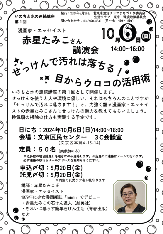 【講演名】赤星たみこさん講演会 〜せっけんで汚れは落ちる!目からウロコの活用術〜