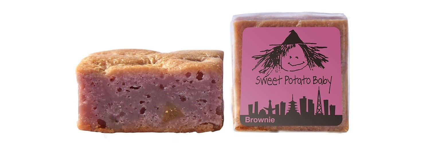 見た目が紫色の今までにないブラウニー。焼き芋のような食感と生地に練り込んだダイスカットの紅はるかがポイント。お芋のやさしい甘さが美味しいブラウニーです。