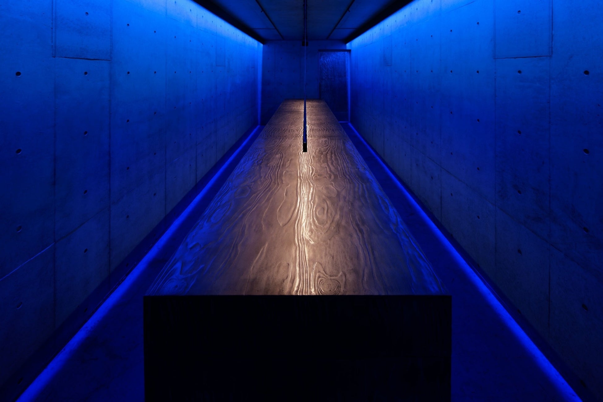 無機質な錫の立方体カウンターと自動演奏ピアノが鎮座する雑味のない空間。LEDライトが深海の青やモノクローム、赤で妖艶な雰囲気を演出します。酒蔵の試飲会やアーティストのイベント、クリエイターの作品発表をサポートし、プライベートパーティーやDJイベントにも対応可能な多用途の空間です。