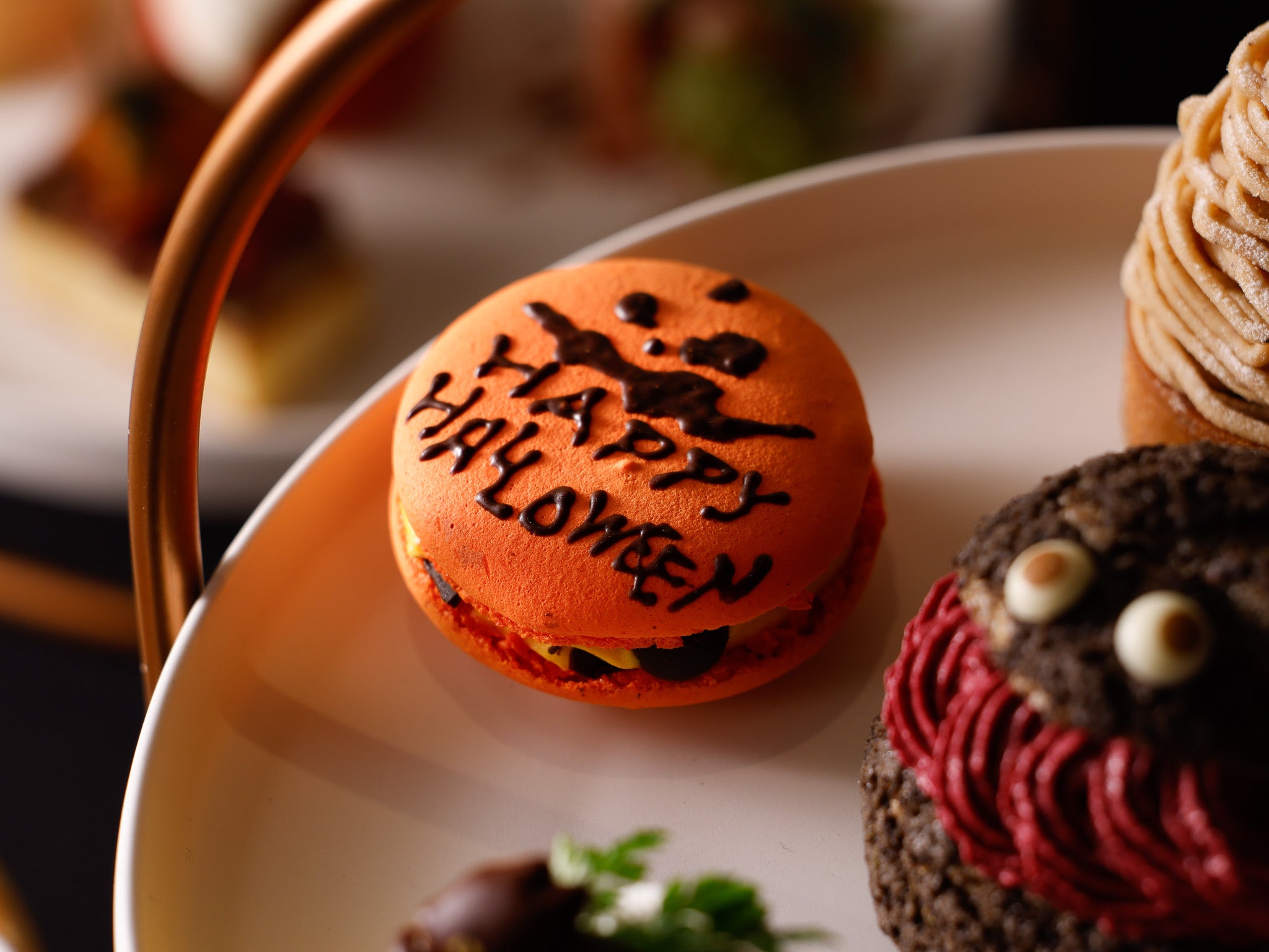 ジャック・オー・ランタンをイメージしたマカロンで、かぼちゃのクリームと刻んだチョコレートをはさんだ、食感も楽しめる一品です。