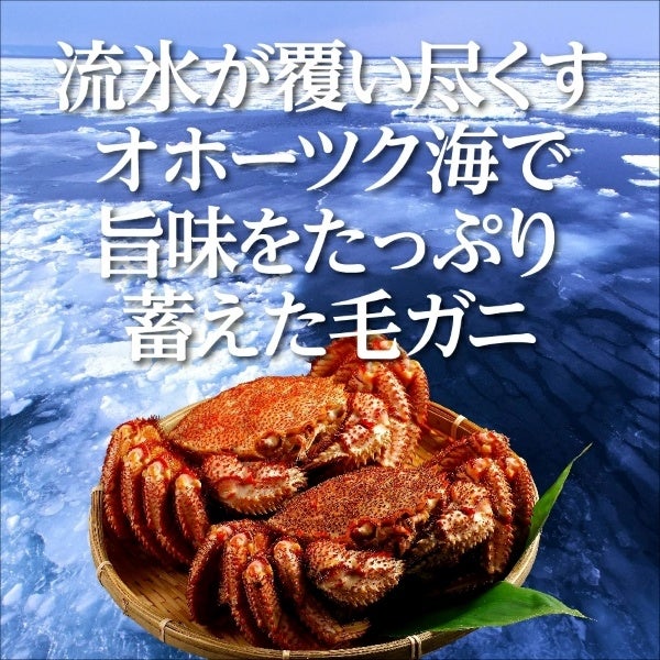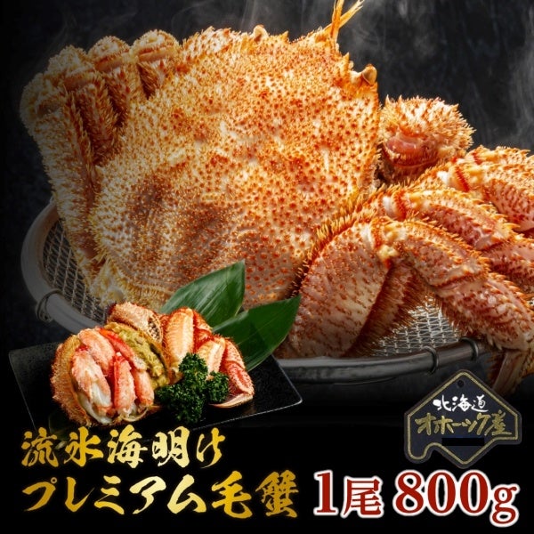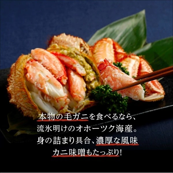 濃厚できめ細やかな身が詰まり、カニ味噌が絶品の流氷明けオホーツク海産毛ガニ。「【北海道産】 流氷海明け プレミアム毛蟹 特大サイズ 800g」。