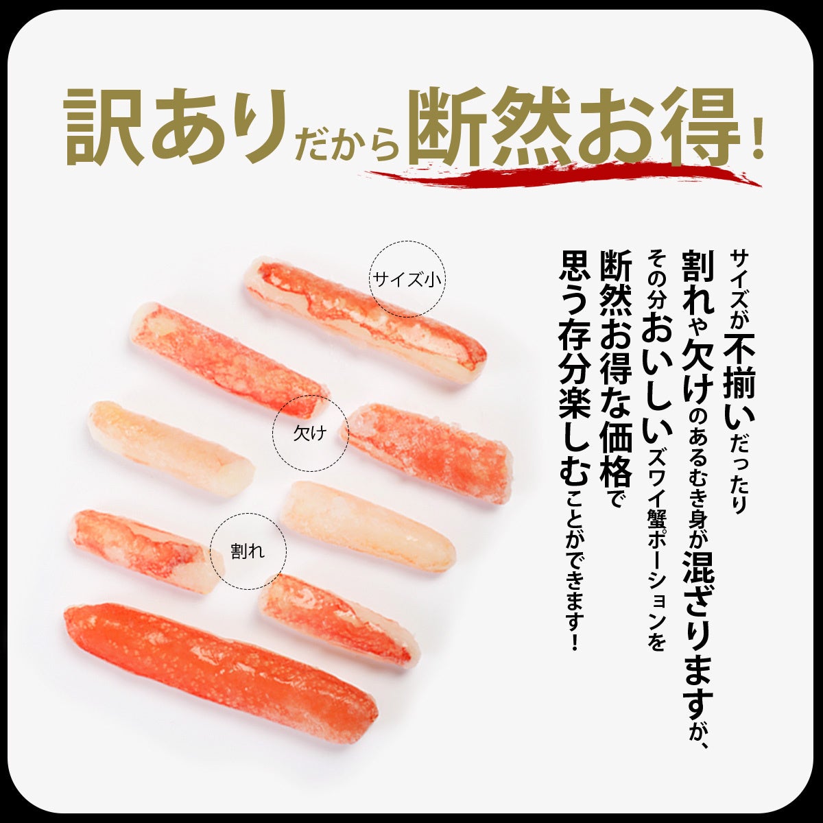 サイズが不揃いであったり割れや欠けのある剥き身が混ざりますが、その分美味しいズワイ蟹ポーションを断然お得な価格でご案内。かにのバター焼きやスパゲッティ、かに雑炊など様々な調理法で思う存分お楽しみいただけます。