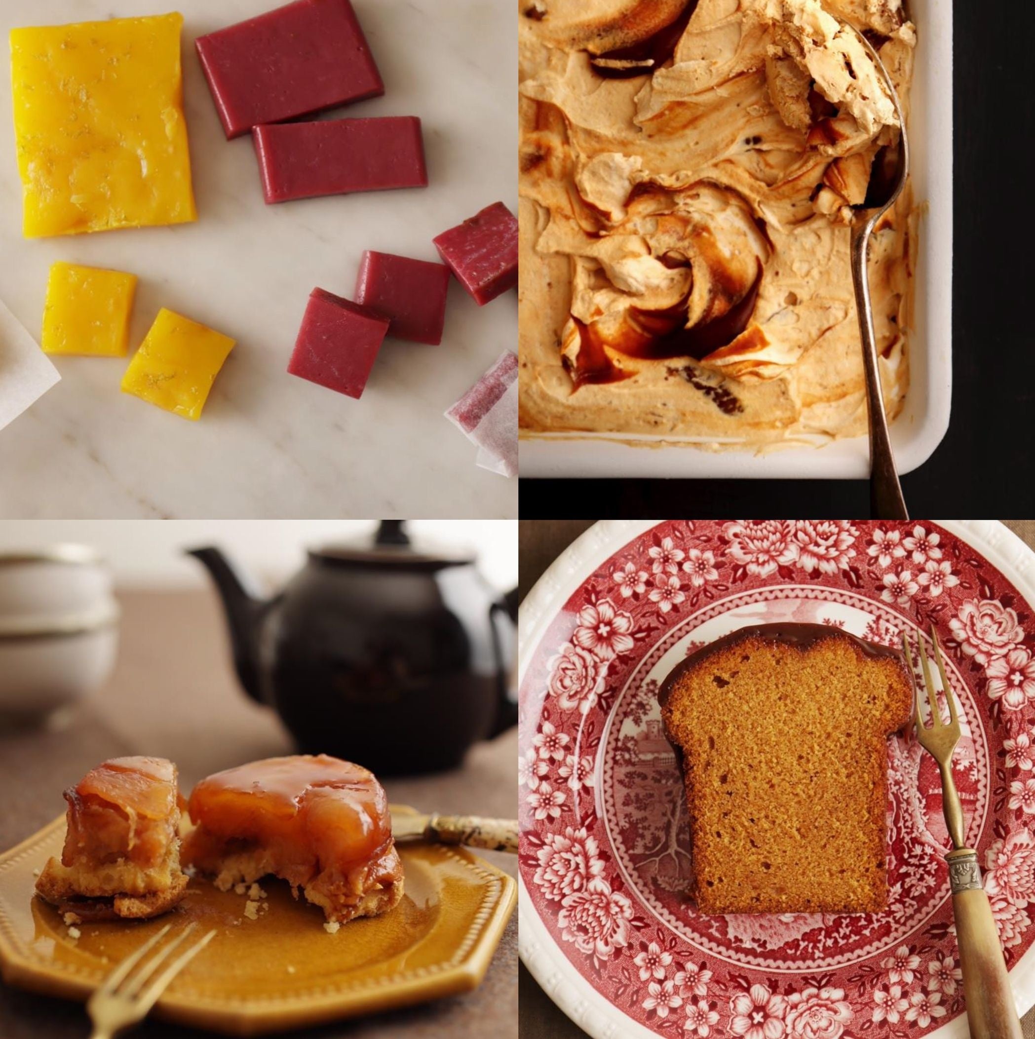 (左上から時計回りに)マンゴーライムキャラメルとラズベリーキャラメル、キャラメルアイスクリーム、ミルクチョコレートのキャラメルケーク、焼きりんごのタルトタタン