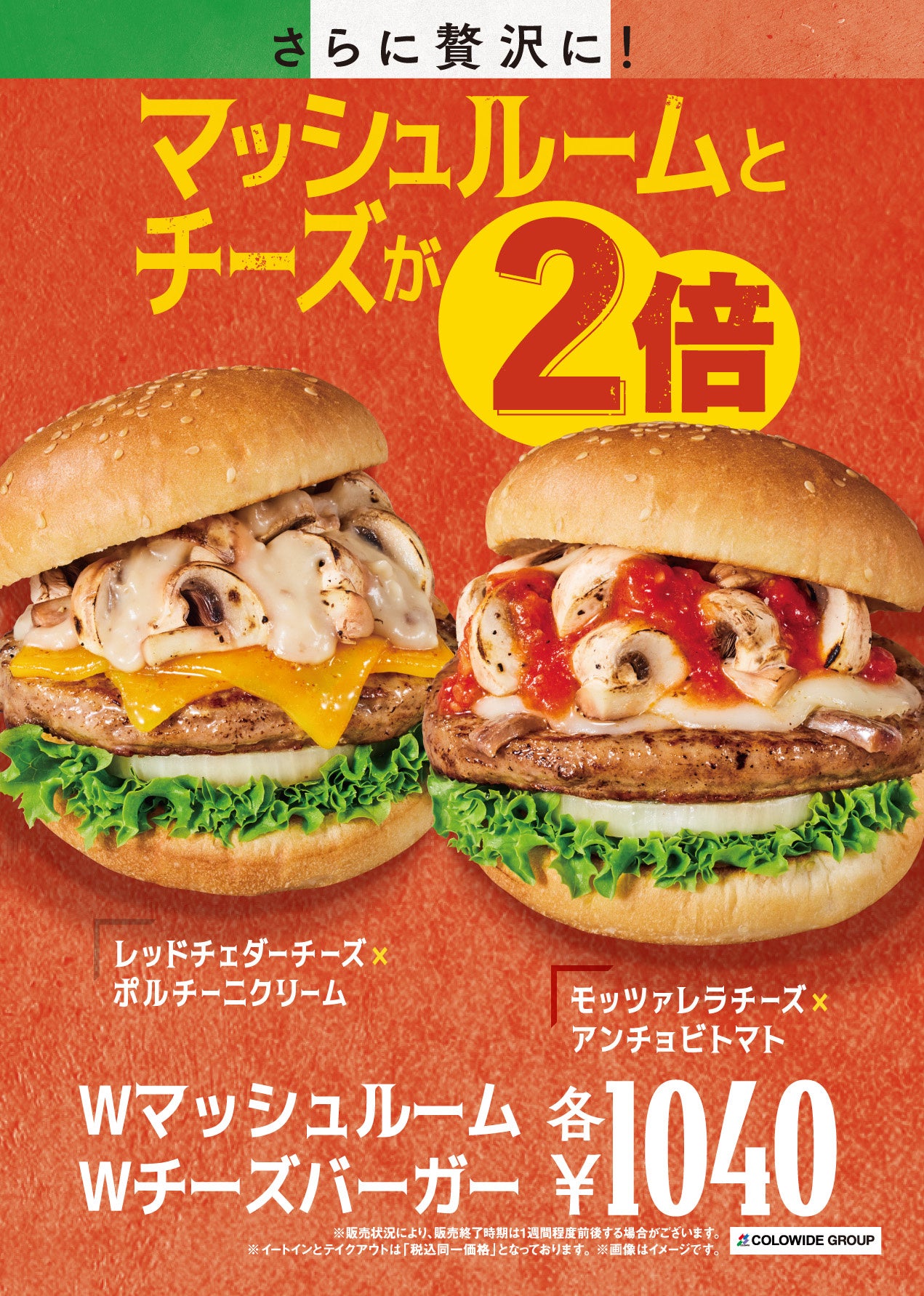 「WマッシュルームWチーズバーガー レッドチェダーチーズ×ポルチーニクリーム」「WマッシュルームWチーズバーガー モッツァレラチーズ×アンチョビトマト」9月25日(水)~10月15日(火)期間限定発売