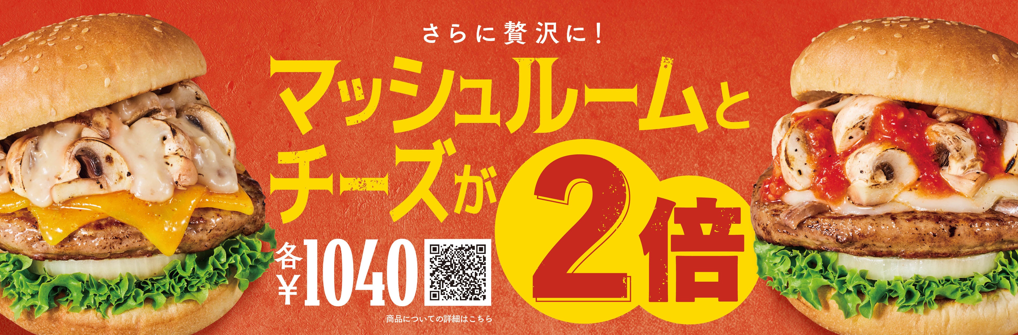 その人気商品に、2倍量のマッシュルーム(ゴロッと1/4カットのマッシュルームが12個!!)と2倍量のチーズをトッピングし、当社マッシュルームチーズバーガー史上最大級のボリュームに仕上げました。食べられるのは、この3週間だけ!お見逃しなきよう、ご賞味ください。
