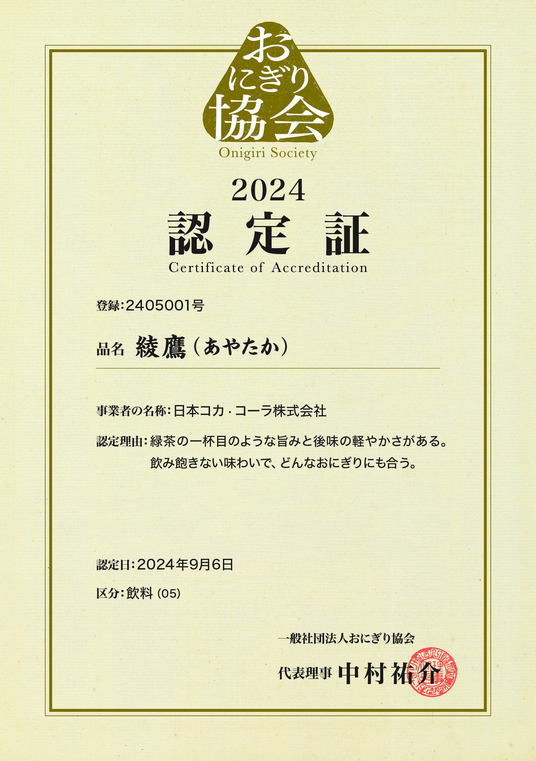 「綾鷹」は、おにぎりを通じて和食文化を国内外に普及させる取り組みをする一般社団法人おにぎり協会より、緑茶の一杯目のような旨みと後味の軽やかさがあること、飲み飽きない味わいでどんなおにぎりにも合うことが評価され、ペットボトル緑茶ブランドとして初めて、おにぎり協会の認定緑茶になりました。