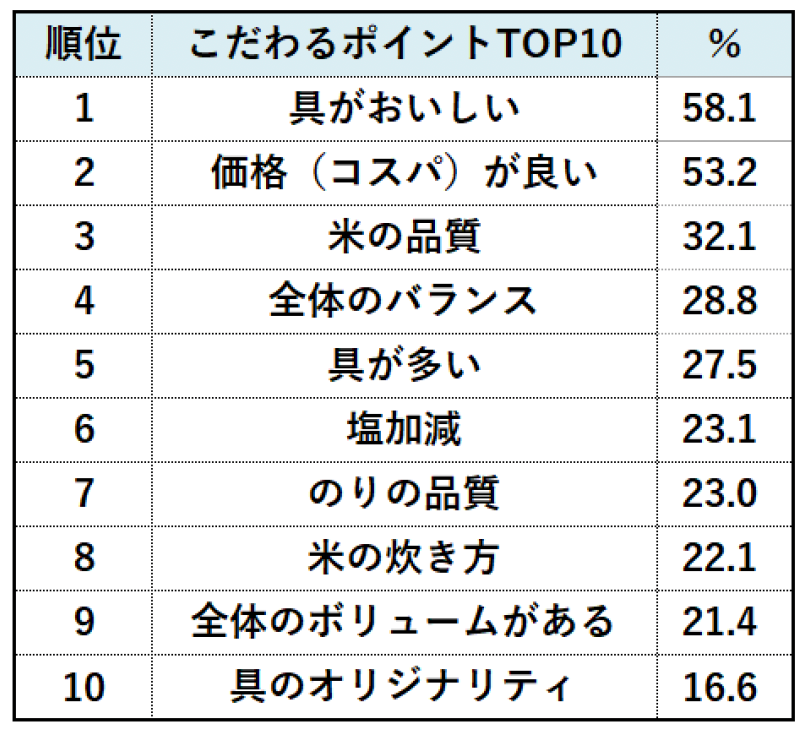 「おにぎりを買うとき、どんなところにこだわりますか?」と聞いたところ、1位が「具がおいしい」58.1%、次いで2位は「価格(コスパ)が良い」53.2%と、いずれも半数を超え、重視しているようです。以降は3位「米の品質」32.1%、4位「全体のバランス」28.8%、5位「具が多い」27.5%と続く結果となっています。