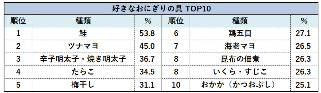 ※提示した選択肢:鮭、具無し(塩むすび)、ツナマヨ、おかか(かつおぶし)、カルビ、辛子明太子・焼き明太子、昆布の佃煮、鶏の唐揚げ、ねぎとろ、たらこ、梅干し、いくら・すじこ、しらす、のりの佃煮、卵かけご飯風、肉味噌、海老マヨ、天ぷら、高菜漬け、卵黄醤油漬け、ちりめん山椒、ネギみそ、悪魔のおにぎり(めんつゆ、青のり、天かす)、鶏五目、チャーシュー、ひじきご飯、あげ(お稲荷さん風)、チャンジャ、その他【自由回答】、おにぎりは好きではない