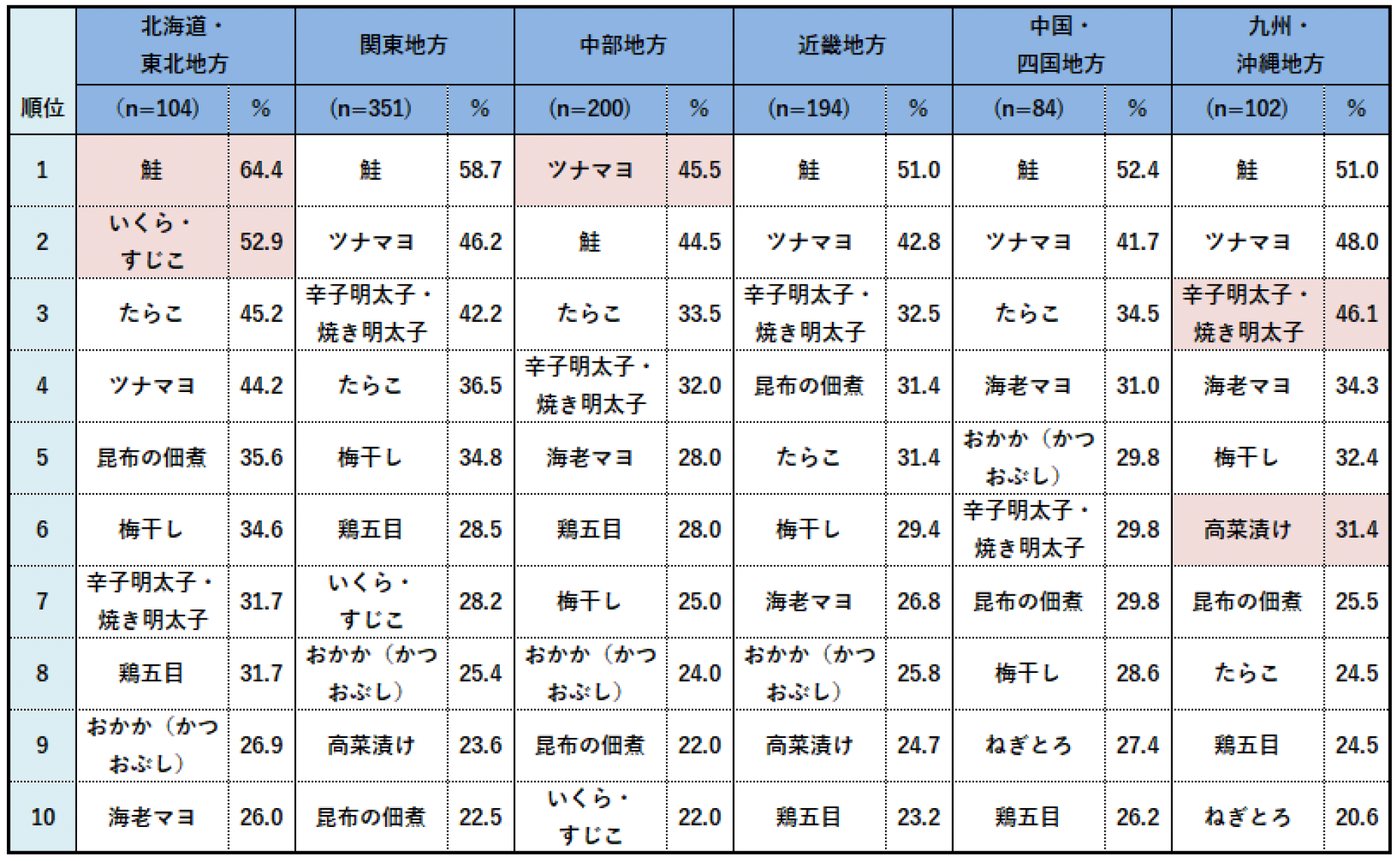 「好きなおにぎりの具」について地域別に見ると、全国ランキングで3位までの「鮭」「ツナマヨ」
