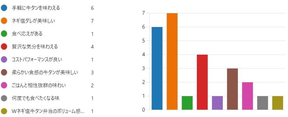 最も多くの票を集めたのは『ネギ塩ダレが美味しい』というポイントでした。以下2位は『手軽に牛タンを味わえる』、『贅沢な気分を味わえる』でした。