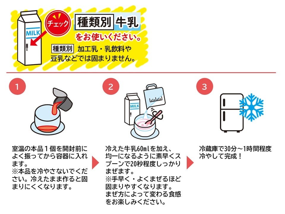 牛乳と混ぜるだけで、ぷるぷる食感のプチデザートが簡単に作れます。ポーション容器に入った個包装で、好きな時に食べたい分だけできるのがポイントです。いちご・マンゴー・杏仁の3種類の味をご用意しました。お子さまから大人まで、幅広い世代にお召し上がりいただける甘くやさしい味わいに仕上げています。