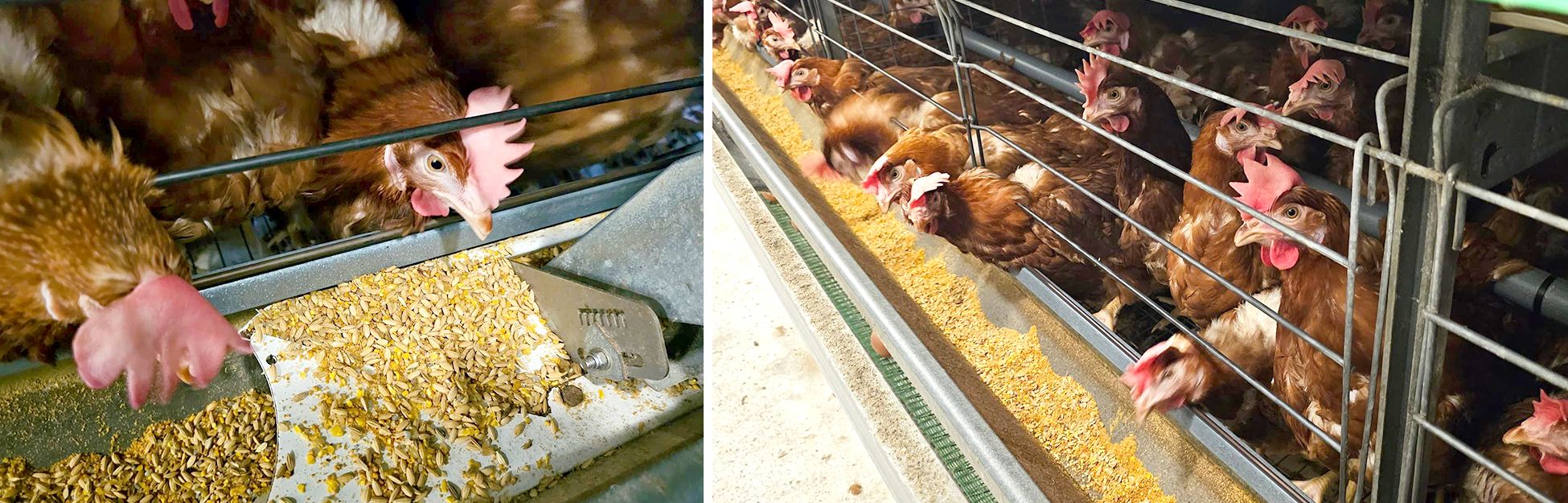 アニマルウェルフェア鶏舎は従来の鶏舎と比べて1ゲージ内の鶏数を少なくしているため、鶏たちは伸び伸びと育つことができます。また、ゲージの一角にはカーテンで仕切られた卵を産むスペースが確保されており、水飲み場は1ゲージに6カ所、エサ場は3箇所設置されています。鶏たちが水やエサを奪い合うことがなく、ストレスを感じずに快適に過ごせる環境が整えられています。