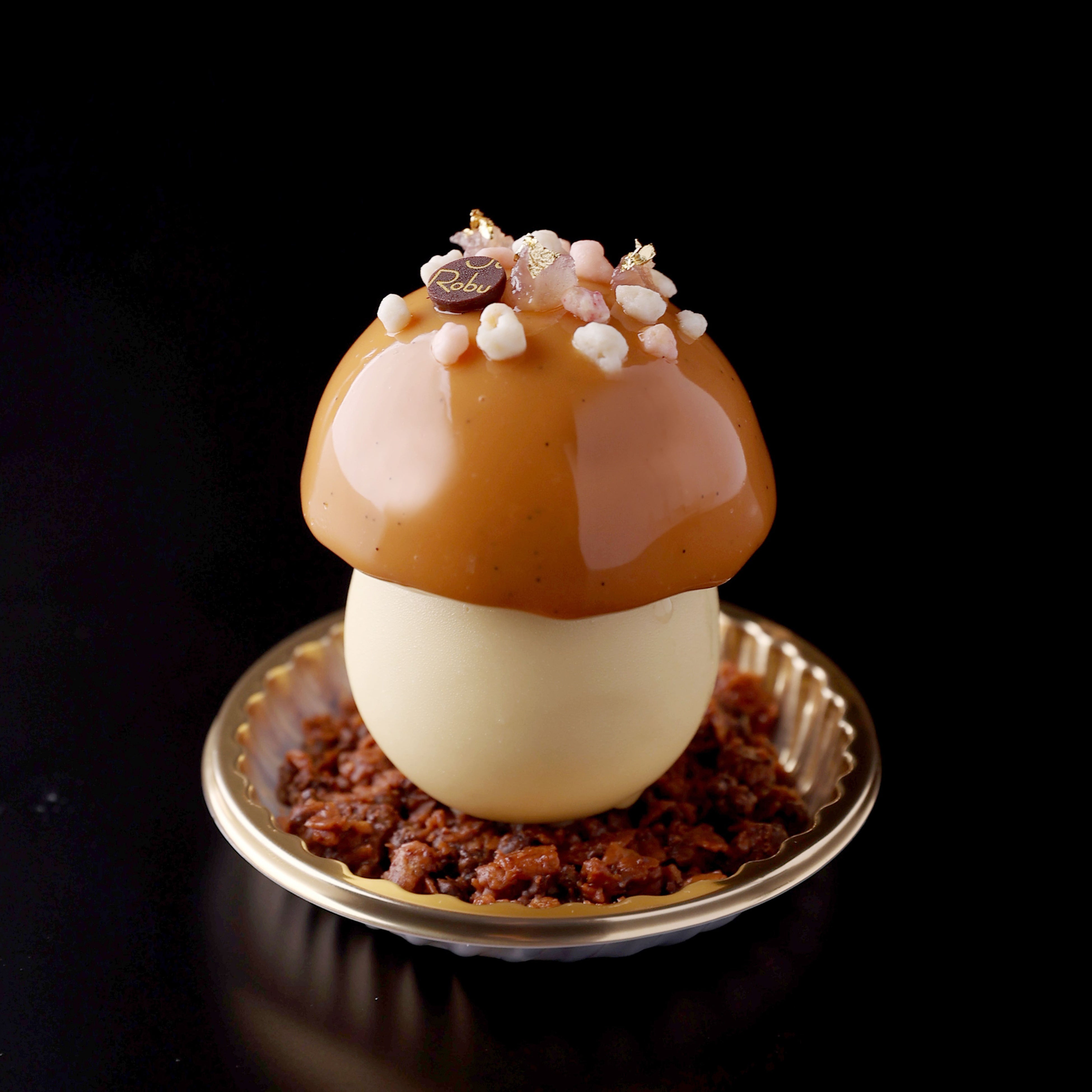 商品詳細 :マロンとカシスのムースを可愛らしいキノコのフォルムに仕上げました。傘部分はカシスのクリームを忍ばせたコクのあるマロンムースを、軸部分はチョコレートクリームを軽やかな味わいのマロンシャンティーで包んだ二層でお楽しみいただける一品です。また、土に見立てたプラリネチョコレートも一緒に召し上がるとさらにサクサクとした食感が加わります。