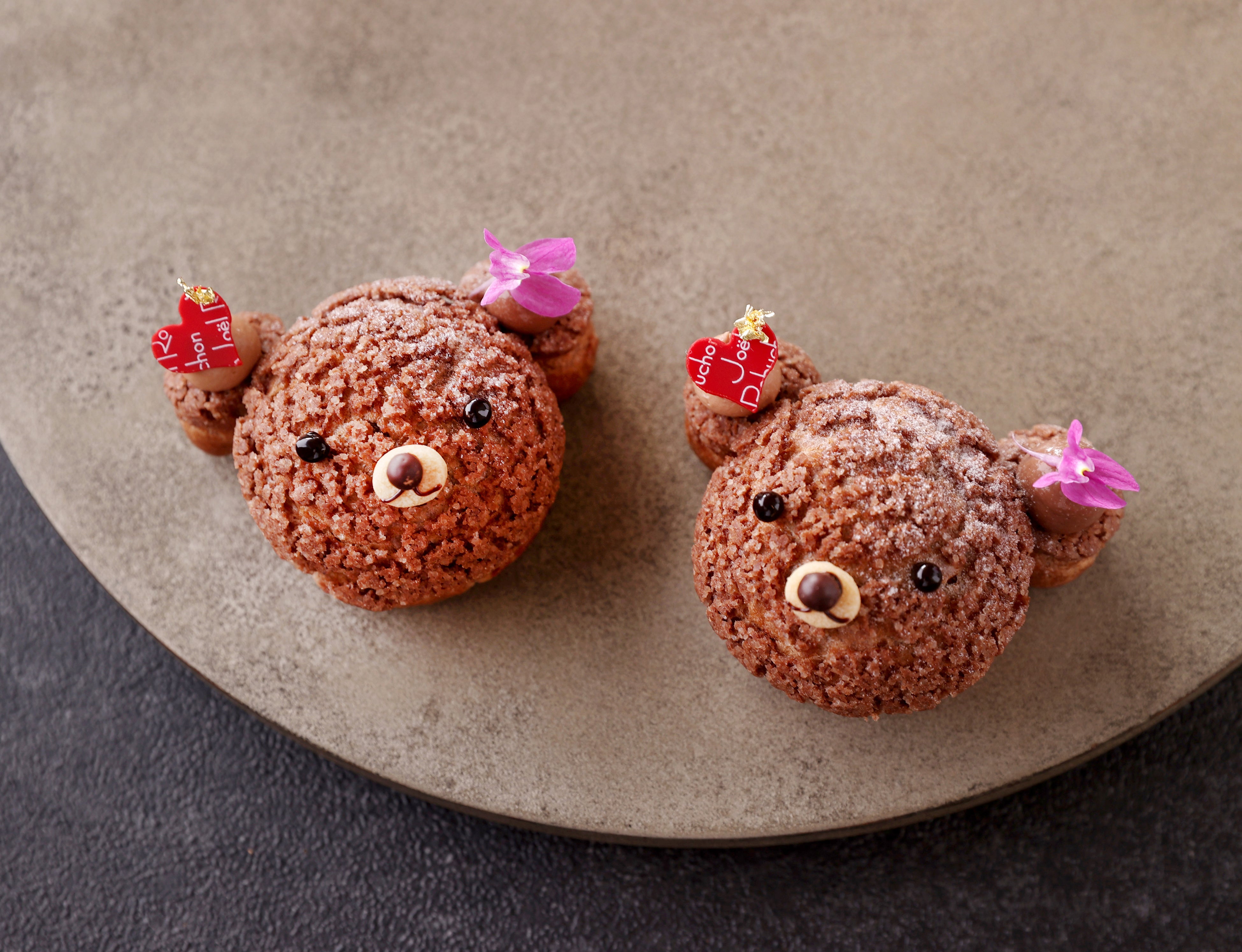 商品詳細 :チョコレートのシュークリームを熊の顔に見立て、仕上げました。チョコレートを使ったシュー生地の中にはカカオ分64%のチョコレートクリームとカカオ分72%のチョコレートカスタードを絞っており、チョコレートを存分にお楽しみいただけます。飾りのお花で個性が出て可愛らしい商品になっています。