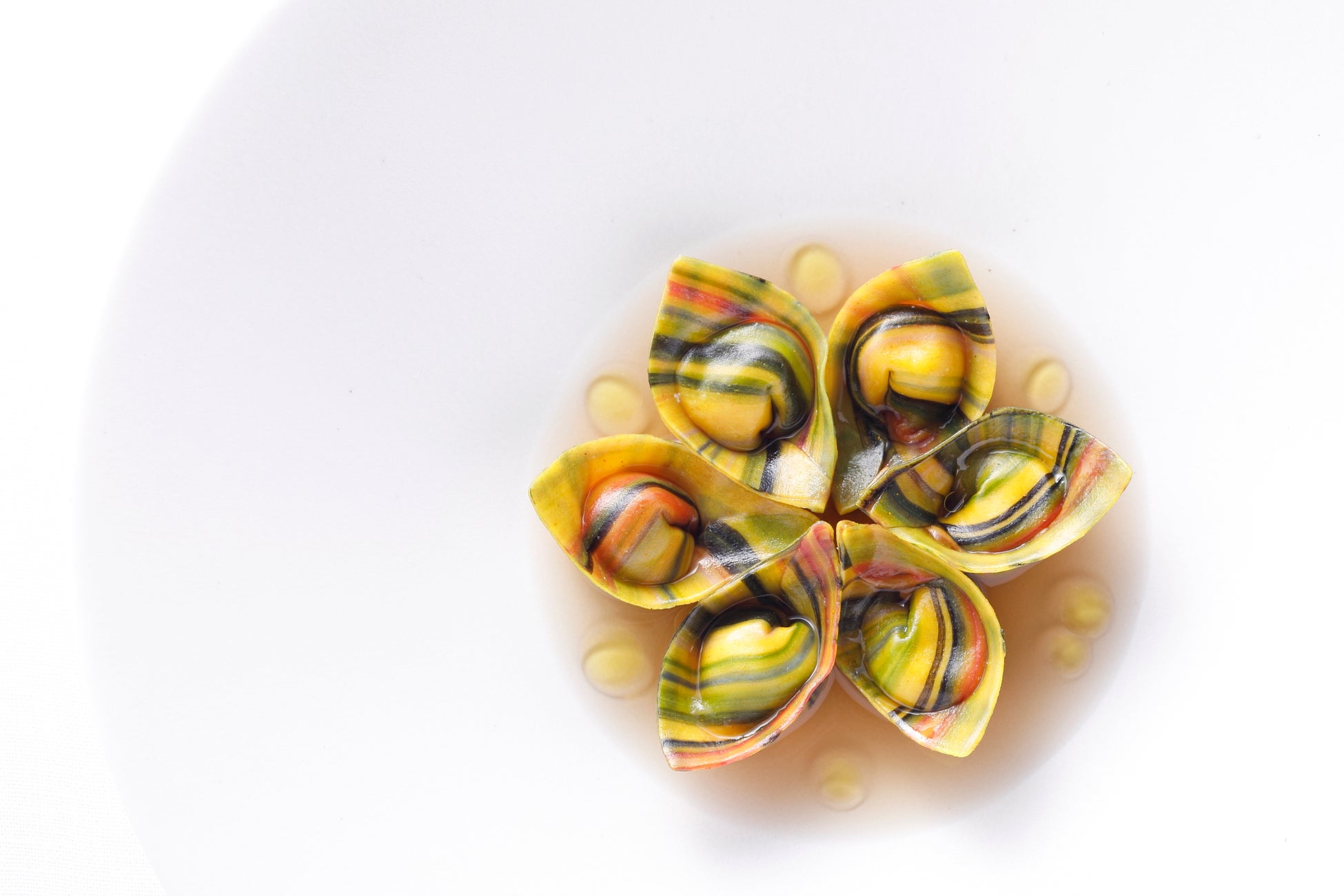 たとえば、ヴィーガンコースで提供している『農園の花』は、野菜をパウダーにして生地に練り込んだラヴィオリで、素材を余すところなく使用したひと皿。「FARO」が大切にしている想いを体現しています。