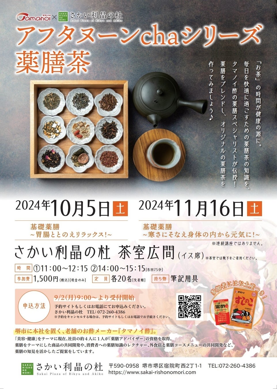 内容 :薬膳インストラクターによるレクチャー、オリジナル薬膳茶ブレンド体験、薬膳お菓子の試食