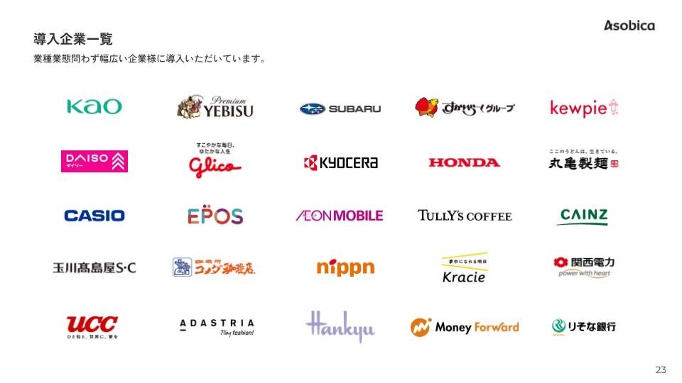 その結果、コミュニティを通じて、既存の優良顧客(ロイヤル顧客)と継続的にコミュニケーションを取り、顕在化していないインサイトを把握することにより、顧客理解の解像度を高め、事業全体の成長に繋げたいという企業側の狙いがあります。こうした流れにより、企業によるコミュニティ導入が加速しており、企業向けコミュニティプラットフォームを運営するAsobicaにおいても、年間経常収益 昨対比1.5倍を達成し、企業としての売上成長は昨対比1.93倍を記録しています。さらに、カルビー・大創産業・花王・サッポロビール・すかいらーくホールディングスなど小売・飲食・流通企業を中心に大手企業の利用が進んでいます。