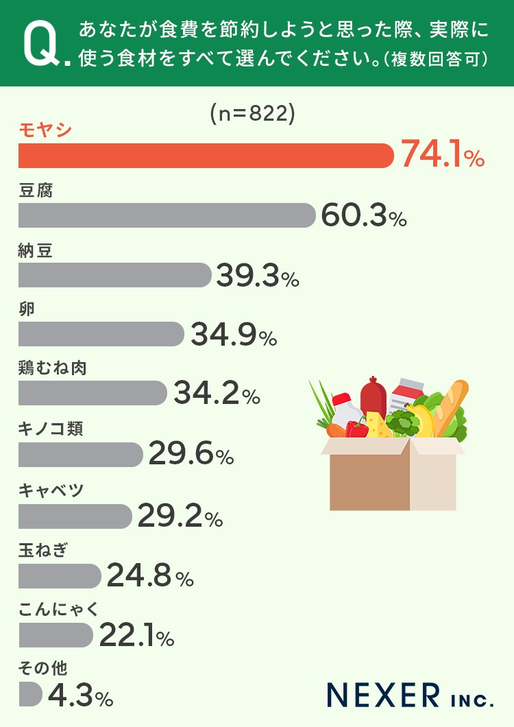 ■食費を節約しようと思った際に使う食材、74.1%が「モヤシ」と回答