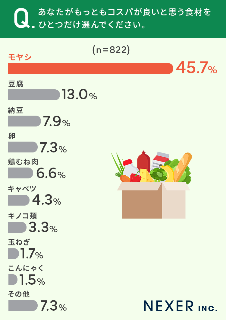 1位は「モヤシ」で、45.7%と半数近くの票を集めました。