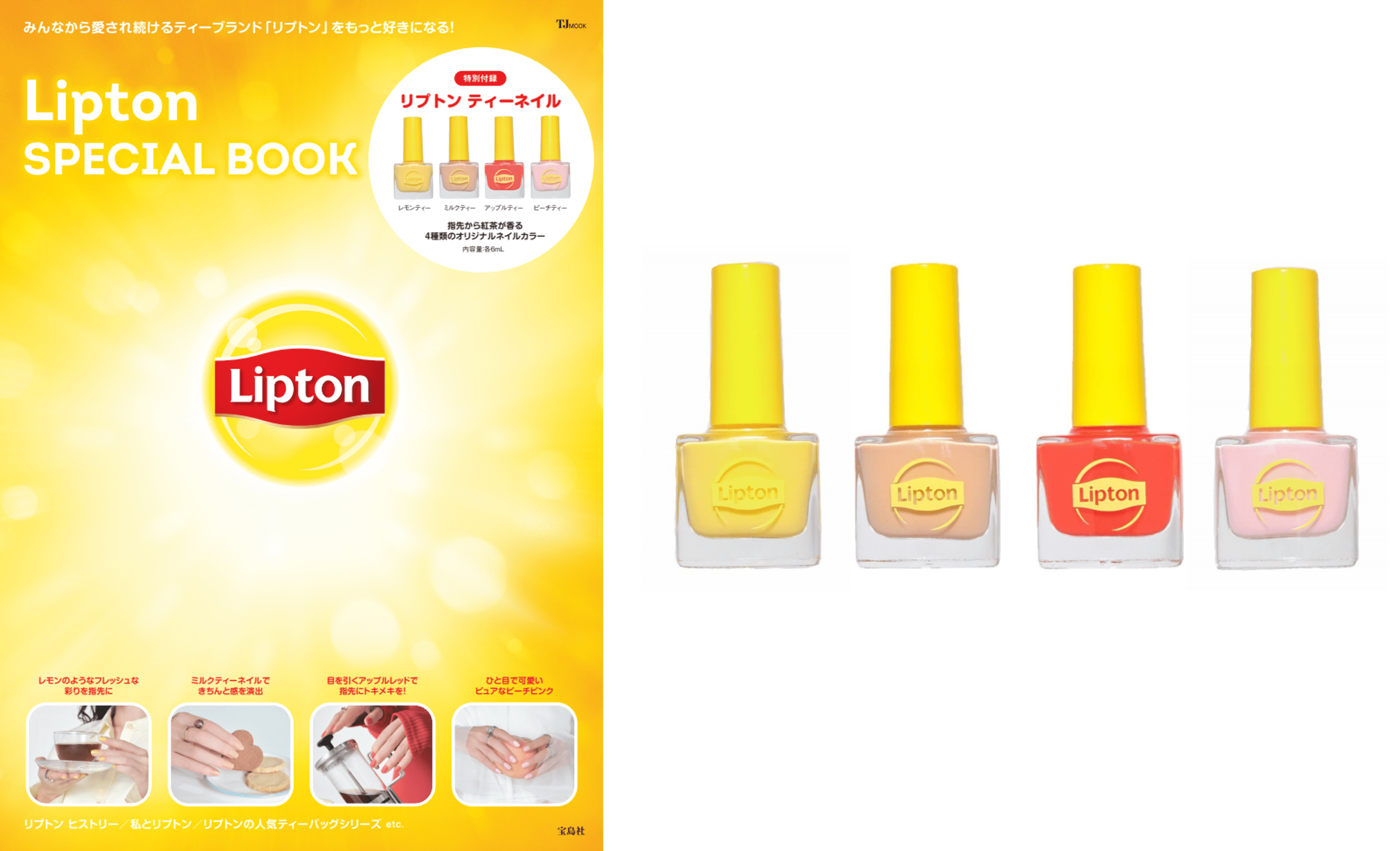 今回、ムック本の付録として、「リプトン ティーネイル」をご用意しました。リプトンの人気定番フレーバー「レモンティー」、「ミルクティー」、「アップルティー」、「ピーチティー」の香りとカラーを再現した4種類のネイルは、リキッドが乾くと指先から紅茶の香りがあふれる特別仕様。その日の気分に合わせて、指先からもリプトンの紅茶をお楽しみください。