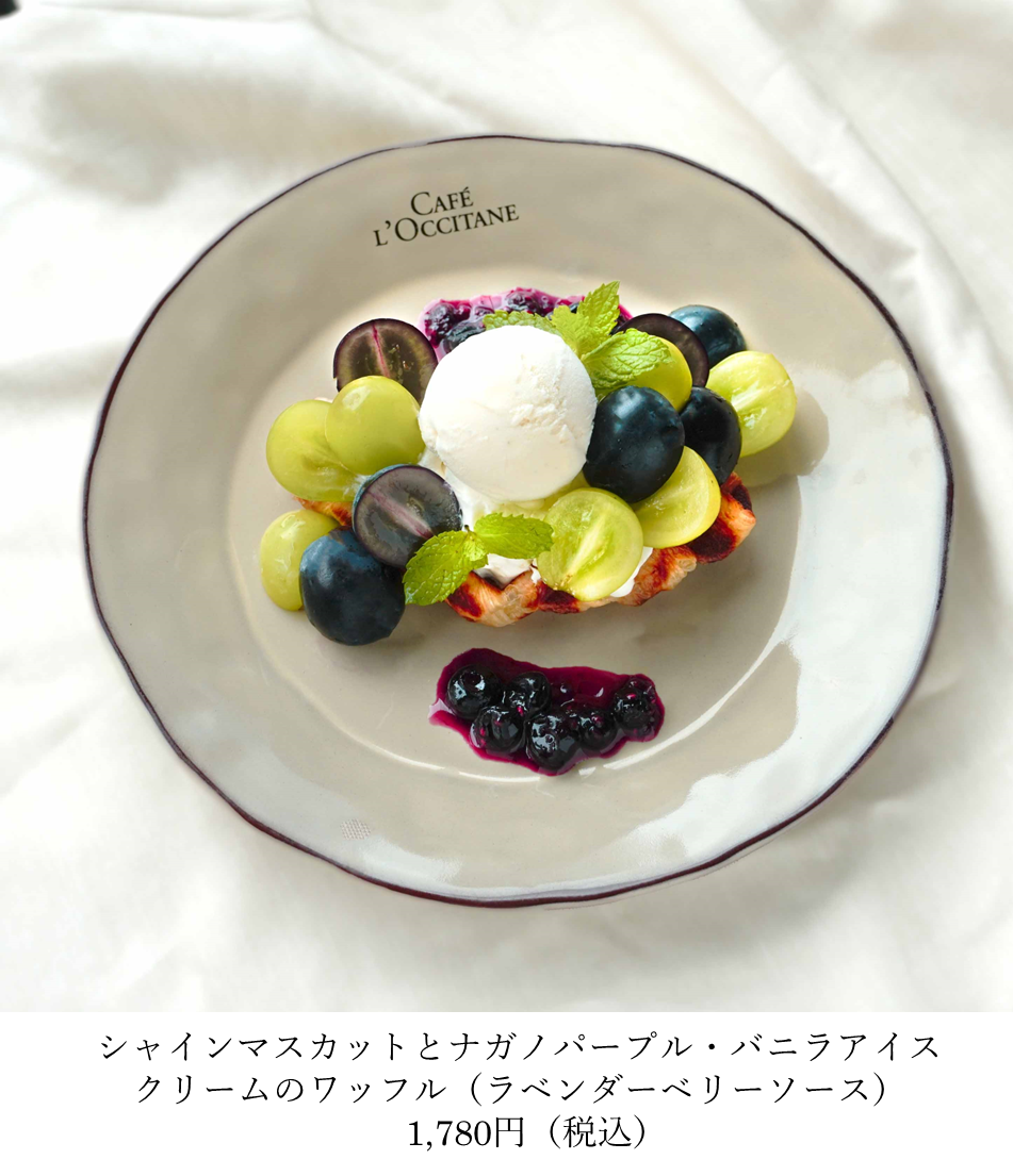 そんな「ロクシタンカフェ」から秋の限定メニューが新登場します。一押しメニューは、カフェで大人気のクロワッサンワッフルに旬のぶどうをふんだんに使用した「シャインマスカットとナガノパープル・バニラアイスクリームのワッフル」。今が食べ頃の2種のぶどう(シャインマスカット・ナガノパープル)にバニラアイスクリーム・ホイップクリーム・ラベンダー風味のベリーソースをあわせたクロワッサンワッフルです。甘い旬のフルーツと香ばしいクロワッサンワッフルのハーモニーをお楽しみいただけます。