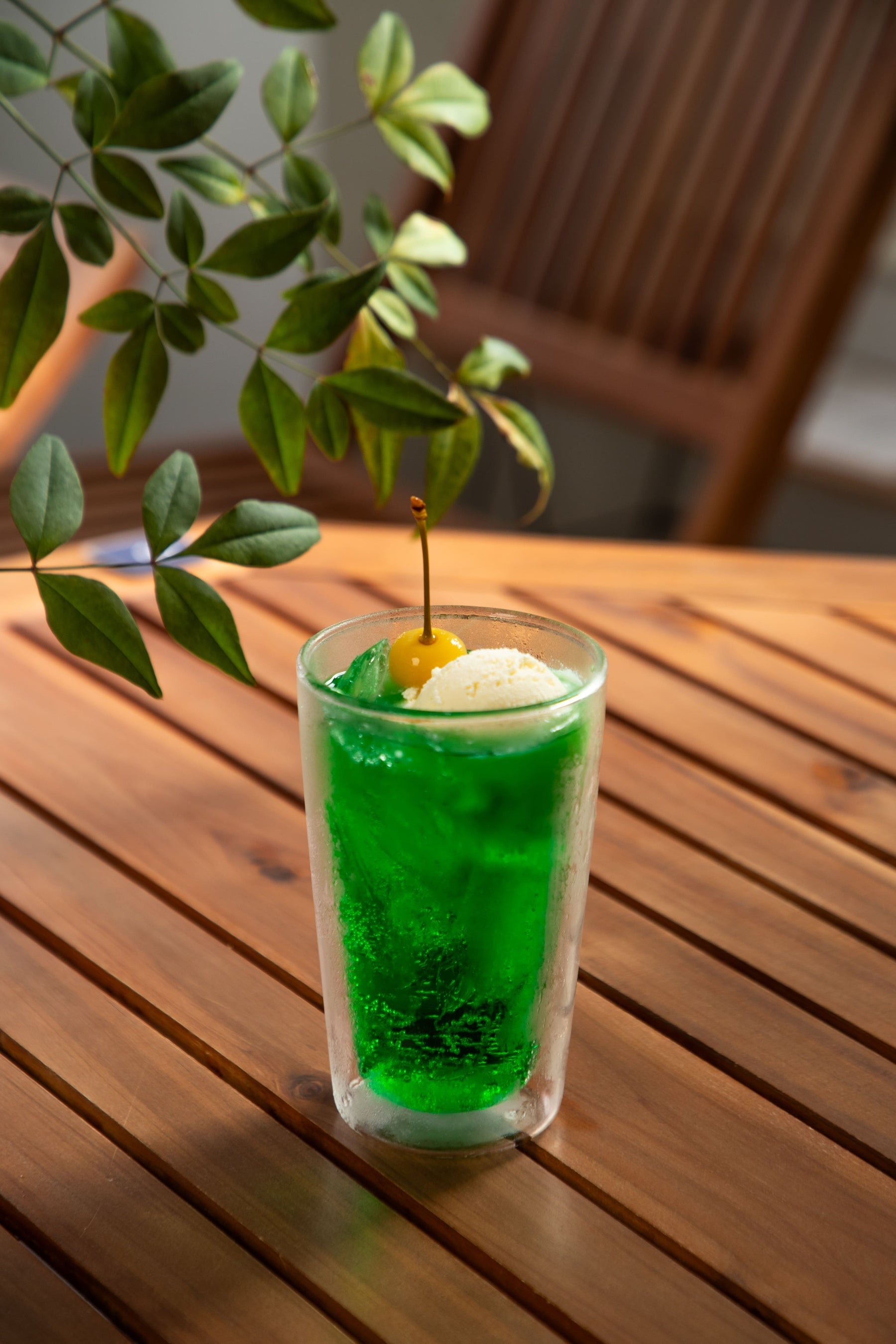 ミドリネコにちなんだミドリ色のドリンク。国産の無着色のさくらんぼをトッピング。