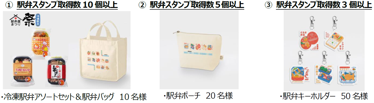 ■応 募 特 典 対象期間中に駅弁スタンプを獲得し、応募フォーム(WEB アプリ内)にご入力いただいたお客さまの中から抽選で駅弁が楽しくなる嬉しいグッズをプレゼント