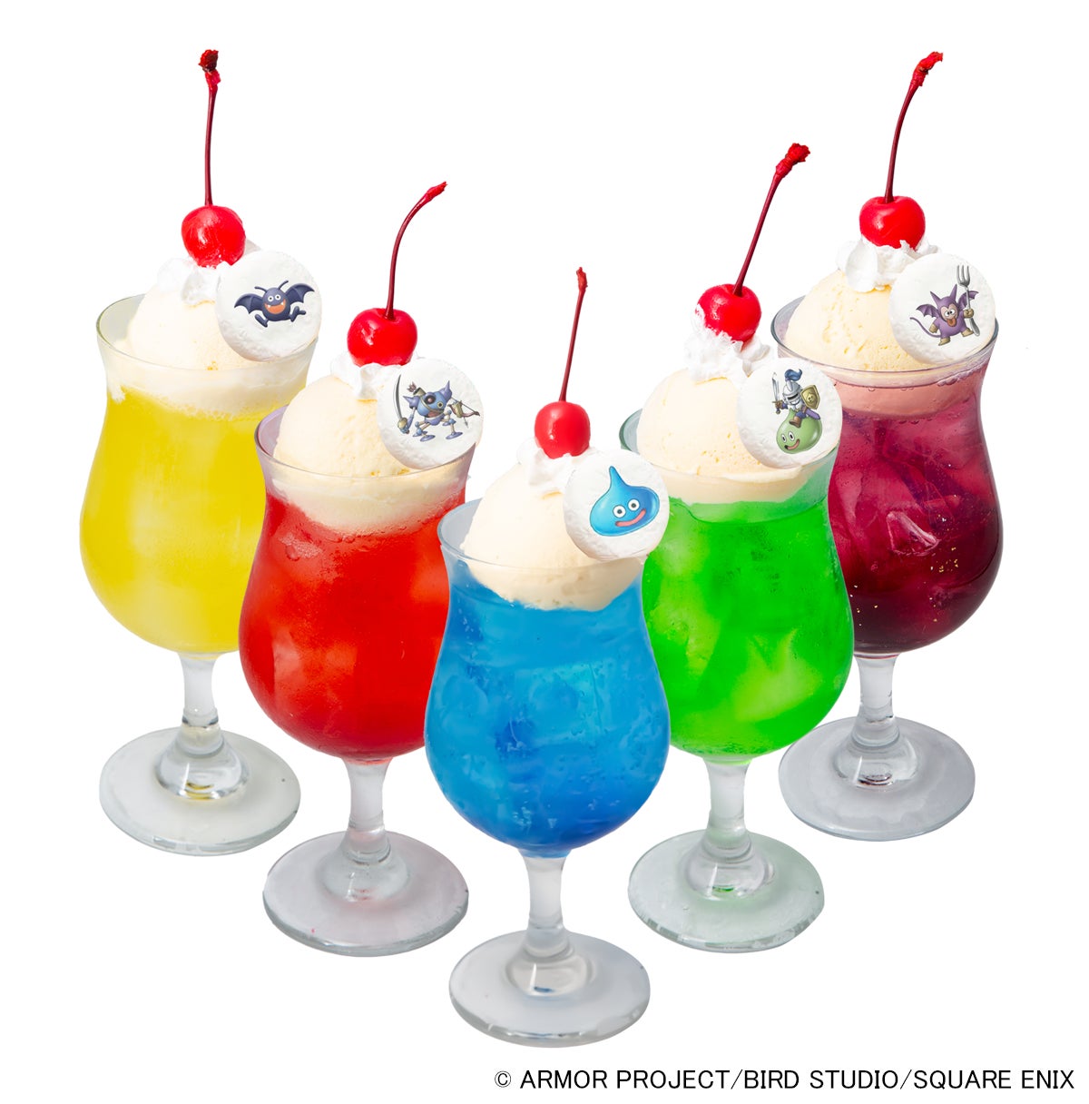 青・赤・緑・黄・紫の5色のクリームソーダを
