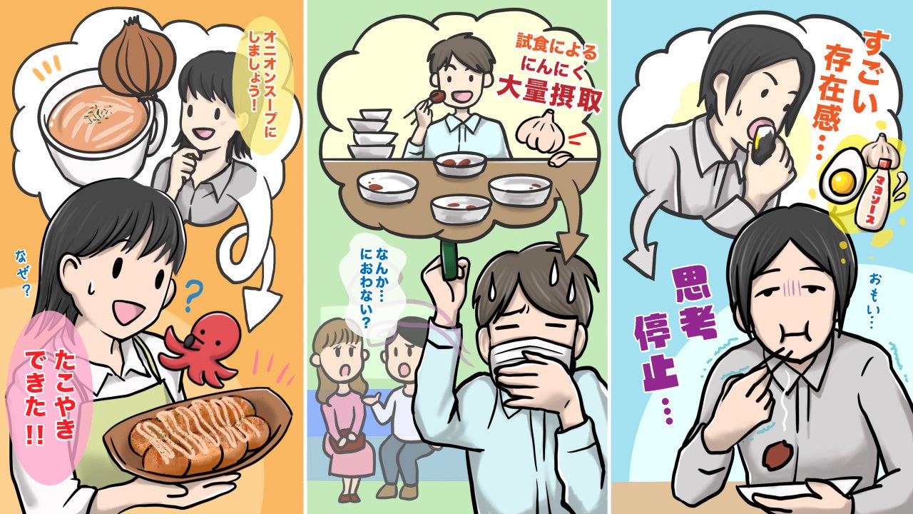 「大盛ごはん!タルタルから揚げ&にんにく豚焼肉丼」の開発では、担当者も「総重量500g(規格重量)はやりすぎたかもしれません。」とつぶやくほど、開発の苦労がありました。試作品の試食は10~15回ほど重ねることも珍しくなく、今回の開発では、にんにくをたっぷり使用した商品特長であることから、試食を重ねるなかで、電車内でいつのまにかマスク必須になってしまいました。