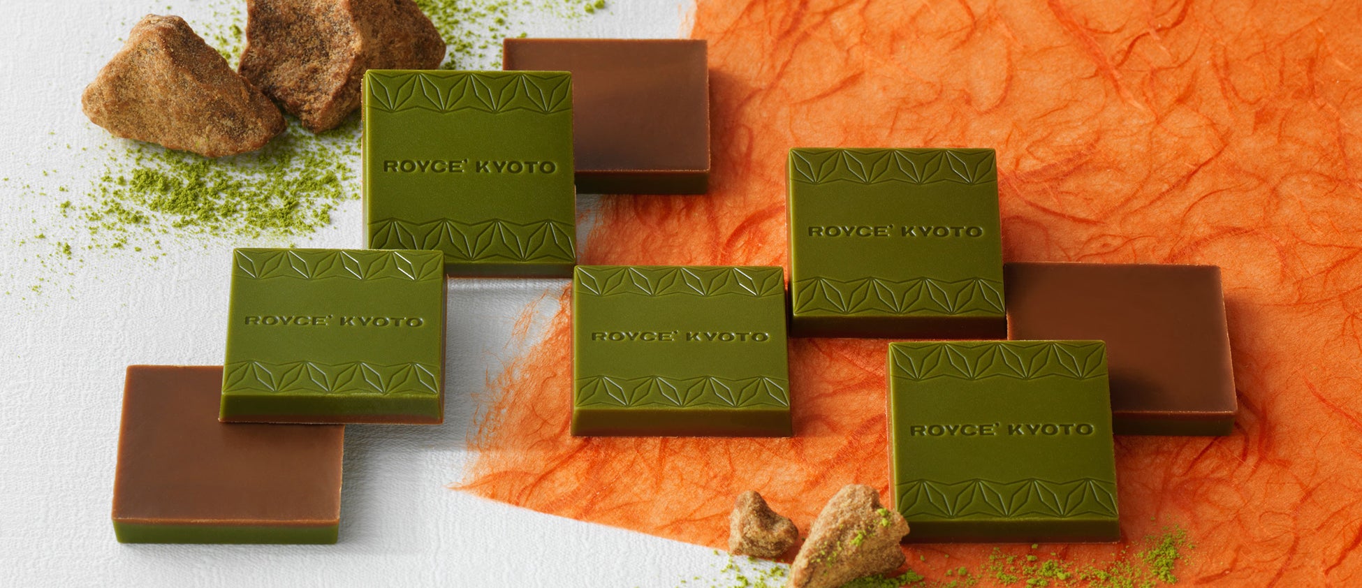 宇治抹茶を使ったチョコレートと、沖縄県産の黒糖を使ったチョコレートを2層に重ね、1枚のチョコレートに仕上げました。苦み・渋み・奥深いコクを感じられる抹茶チョコレートの層と、素朴でまろやかな味わいの黒糖チョコレートの層、それぞれの個性が輝く味わいです。黒糖に含まれるミネラル分から感じられる塩味がアクセント。